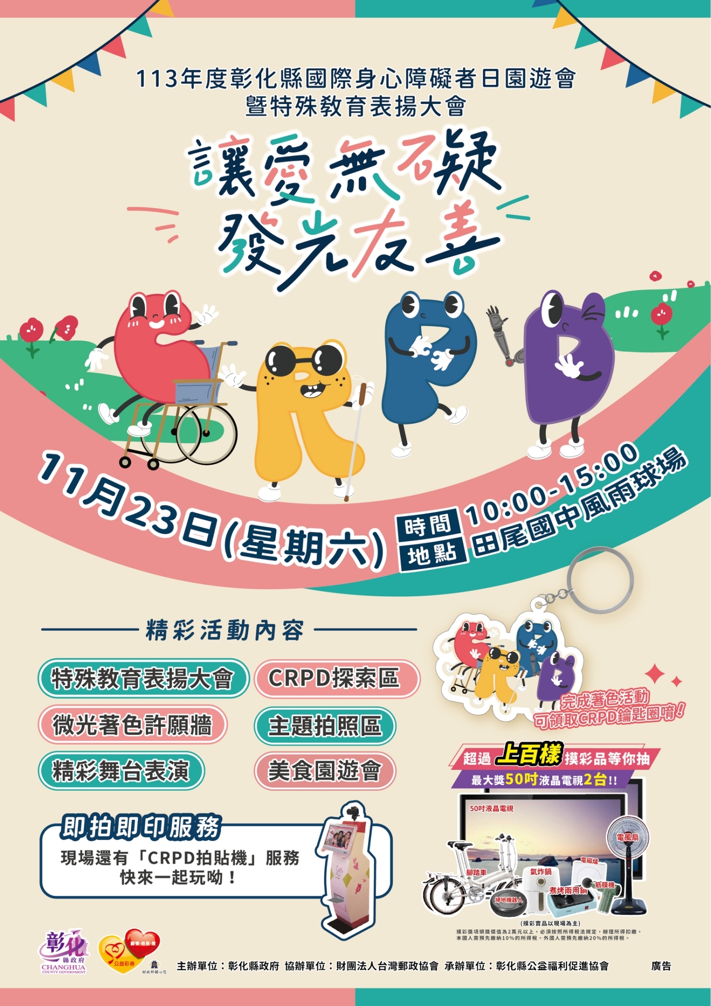| 二、 | 活動訂於113年11月23日(星期六)10時至15時,假彰化縣立田尾國民中學(彰化縣田尾鄉饒平村中學路2段18號)舉辦,參與對象為本縣身心障礙者社團及其家屬、一般民眾預計1,500人以上。 |