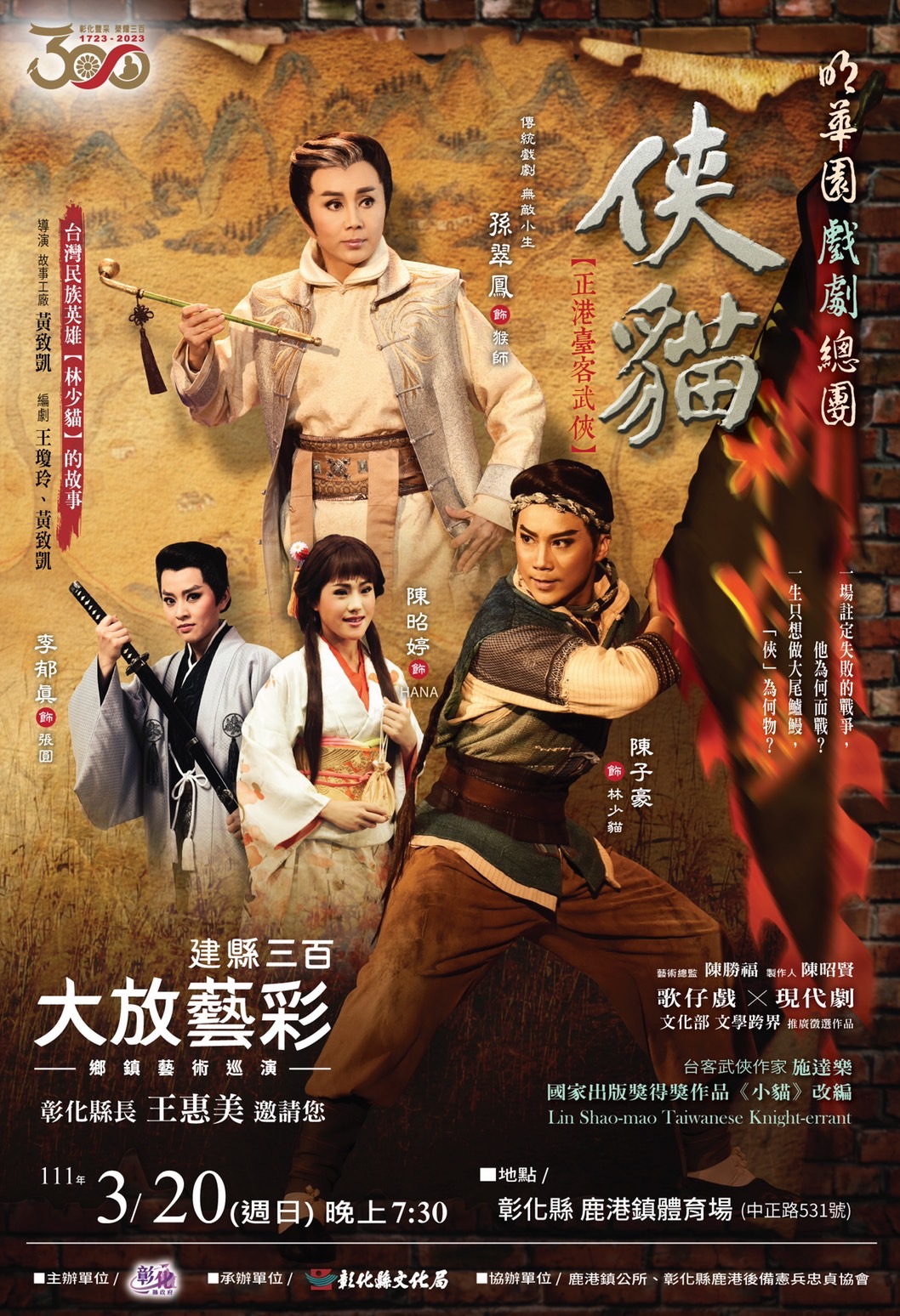 彰化縣政府「建縣三百大放藝彩--鄉鎮藝術巡演」,3月20日(星期日)下午7時30分於鹿港鎮立體育場,演出「明華園戲劇總團」《俠貓》,免票入場,歡迎闔家觀賞。